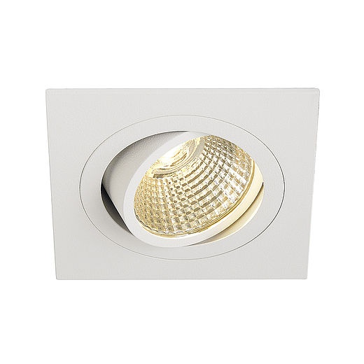 The innovative NEW TRIA LED downlight set appears elegant in its simplicity and effectiveness. Available in white or brushed aluminum, you can choose between a round or square shape. Equipped with a powerful, warm white COB LED with incorporated LED driver, this set meets the requirements of general lighting needs. Furthermore, it is adjustable by 30°. The electrical connection is made directly to 230V mains supply. This luminaire contains built-in LED lamps. EEK: A - A++. The lamps cannot be changed in the luminaire.