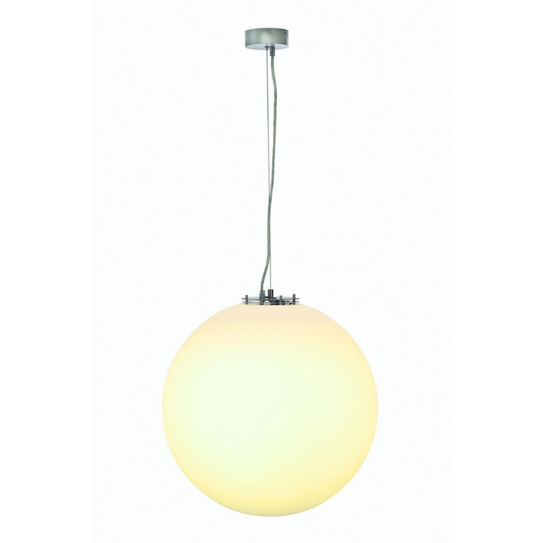 The ball-shaped high-voltage pendant luminaire ROTOBALL consists of a lampshade made from heat resistant plastic, which is visually complemented by a silvergrey steel bracket. The voluminous lampshade ensures homogeneous illumination properties of the energy-saving light bulb with standard E27 socket. A matching ceiling canopy is included in the package. The ROTOBALL pendant luminaire is ready for direct connection to 230V mains supply. This luminaire is compatible with bulbs of the energy classes: A - A+